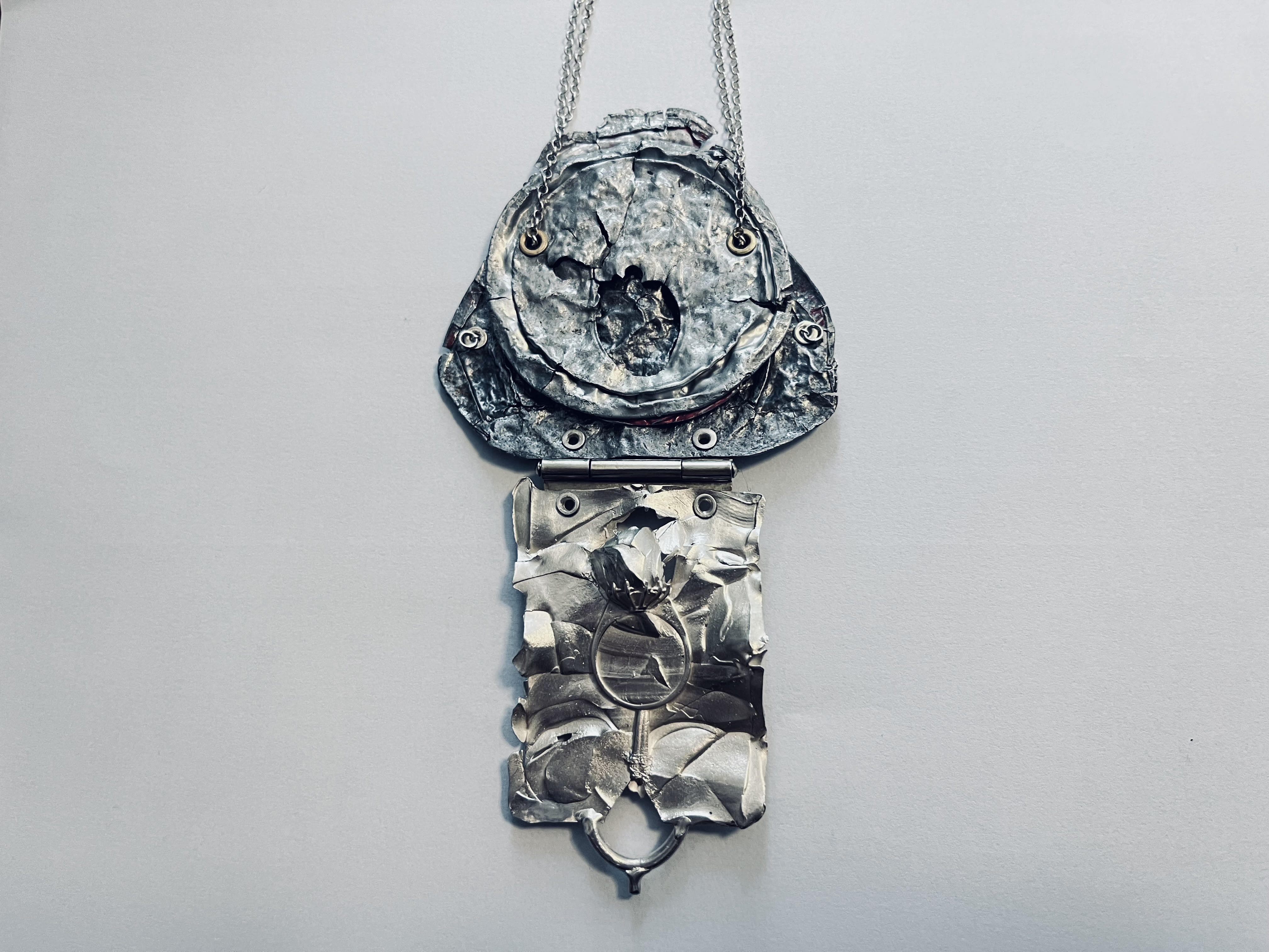 Stern Schocken’s work often engages with political themes, including the Israeli-Palestinian conflict. ‘Caution, Sharp Edges’ series repurposed discarded materials, such as crushed soft-drink cans collected by the artist near the Kalandia military checkpoint, into precious pendants and wall pieces. These works highlight Palestinians’ hardship and advocate for coexistence, embodying her belief in the transformative power of art to inspire recognition and change.